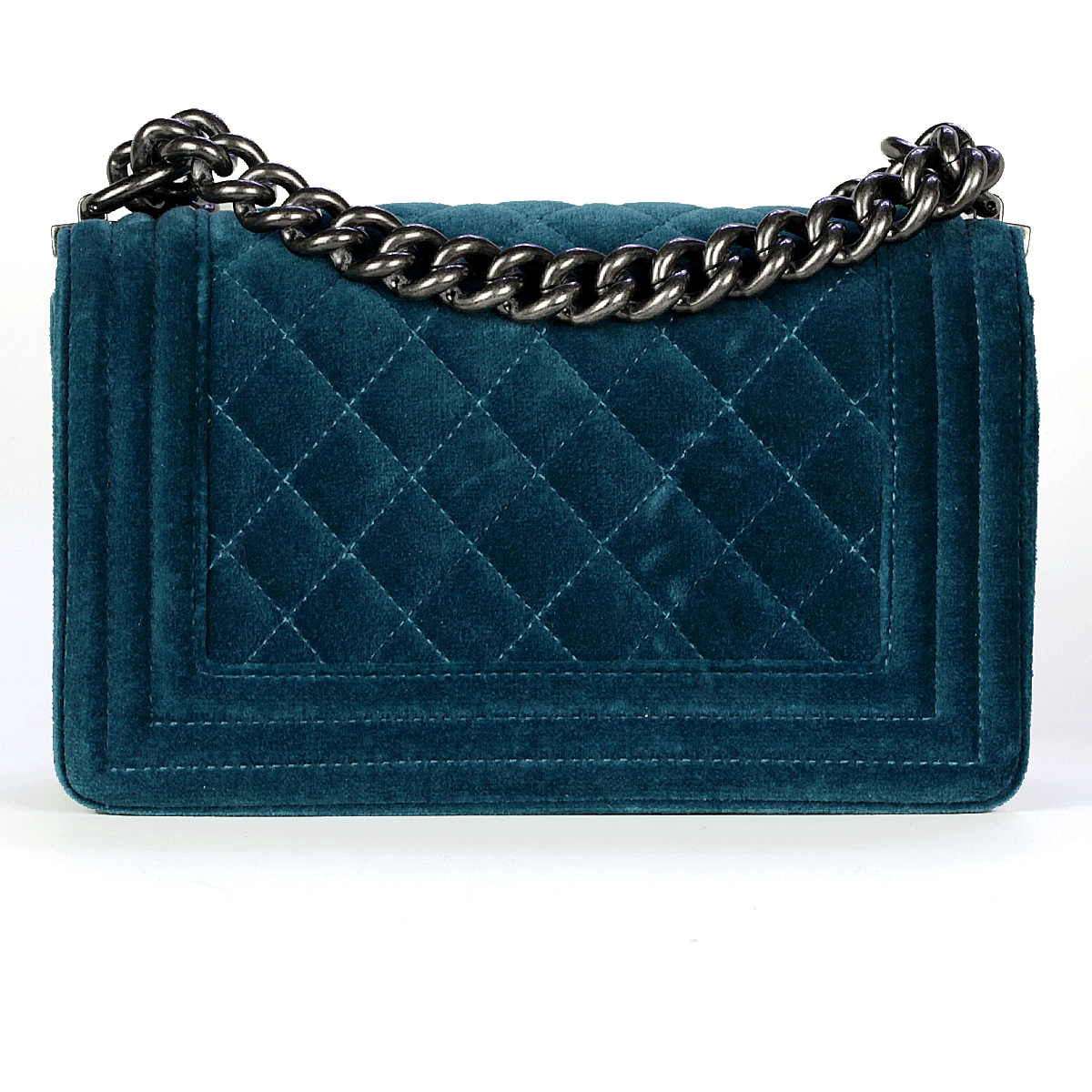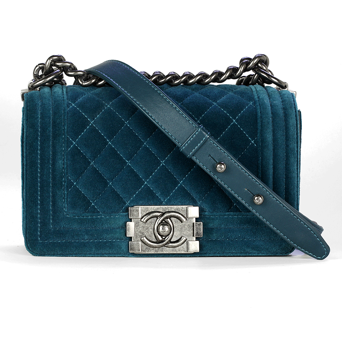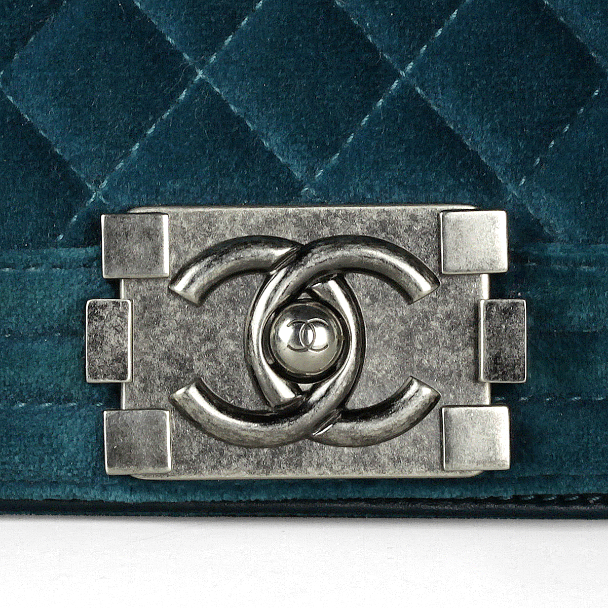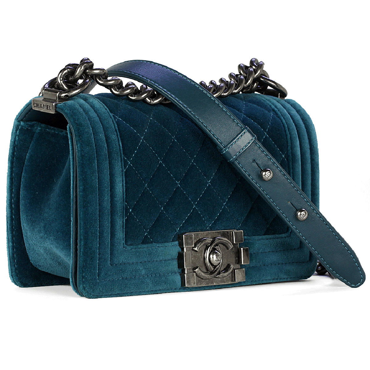 Sac Chanel Boy en velours turquoise matelassé avec du matériel en ruthénium petit