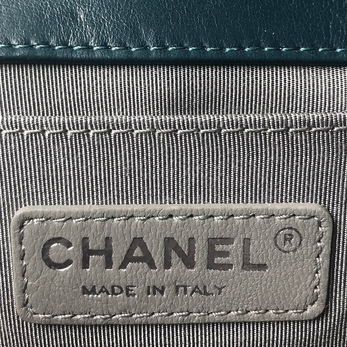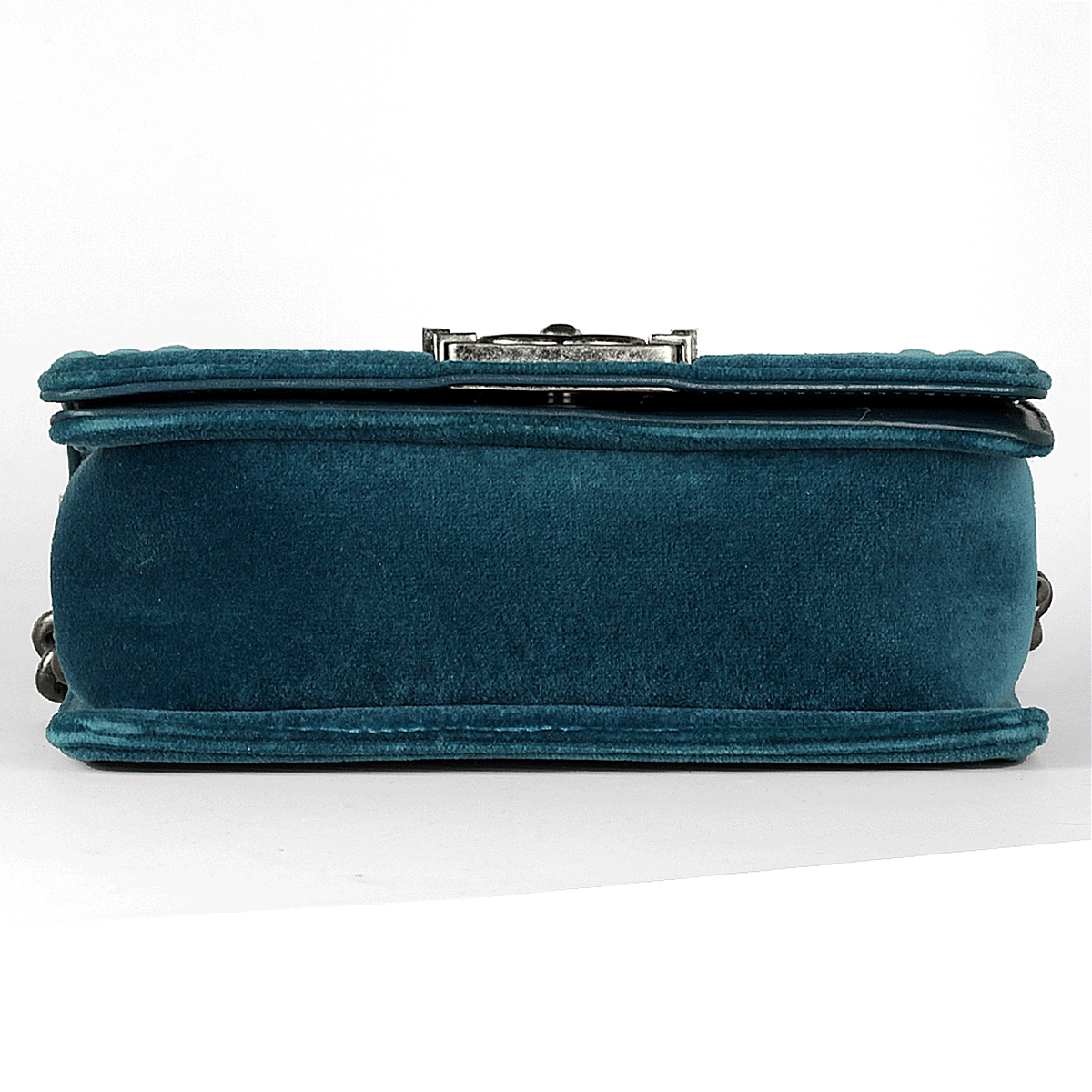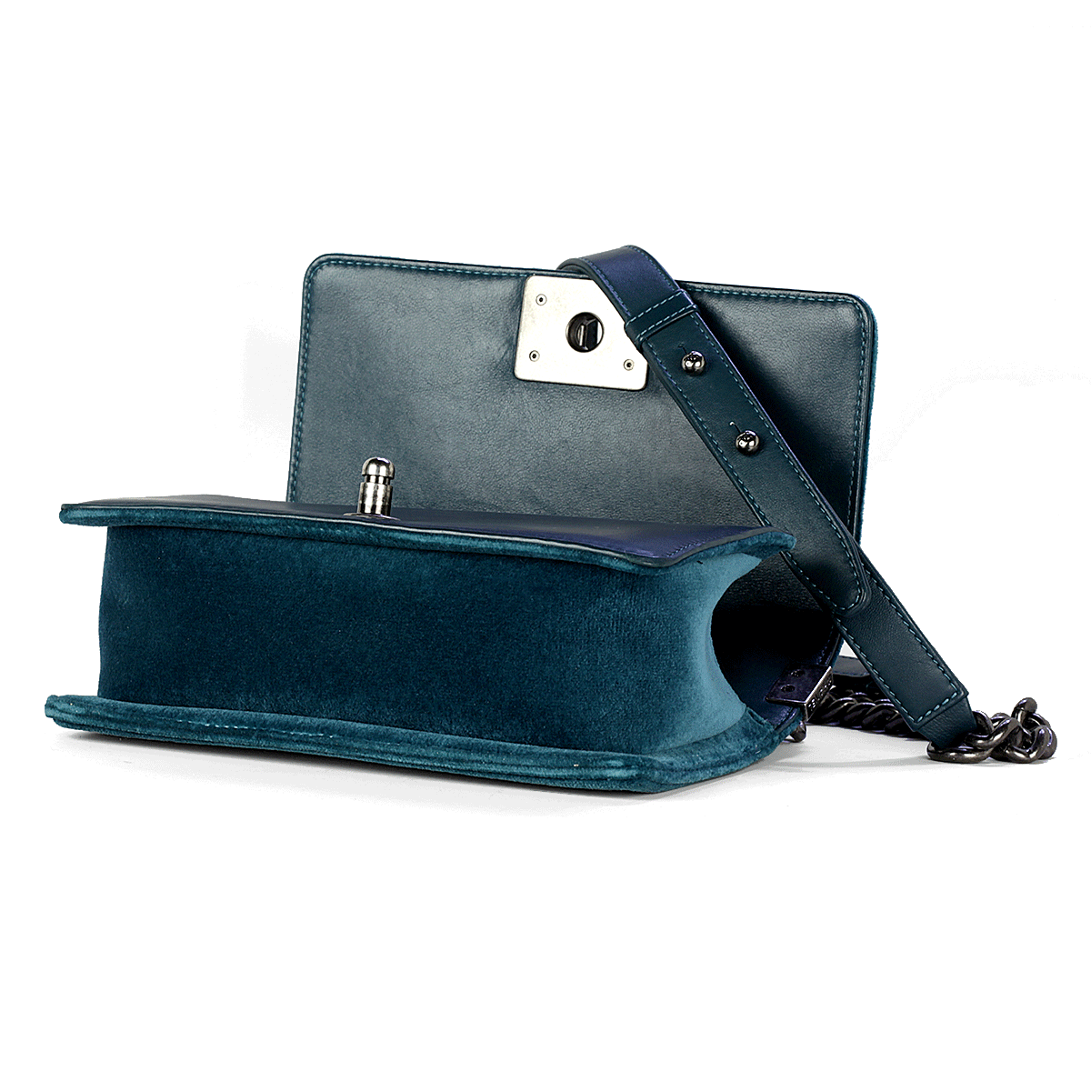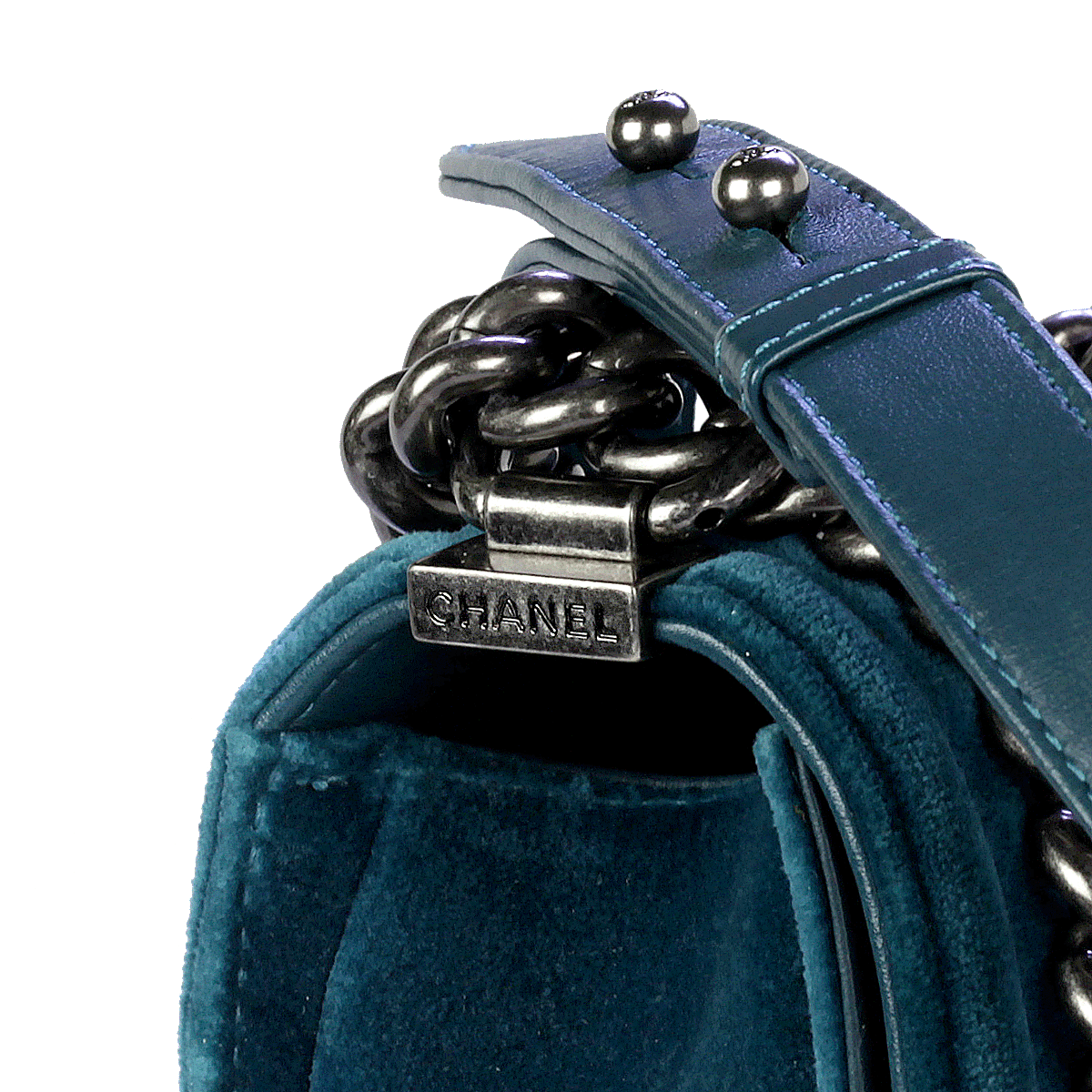 Sac Chanel Boy en velours turquoise matelassé avec du matériel en ruthénium petit