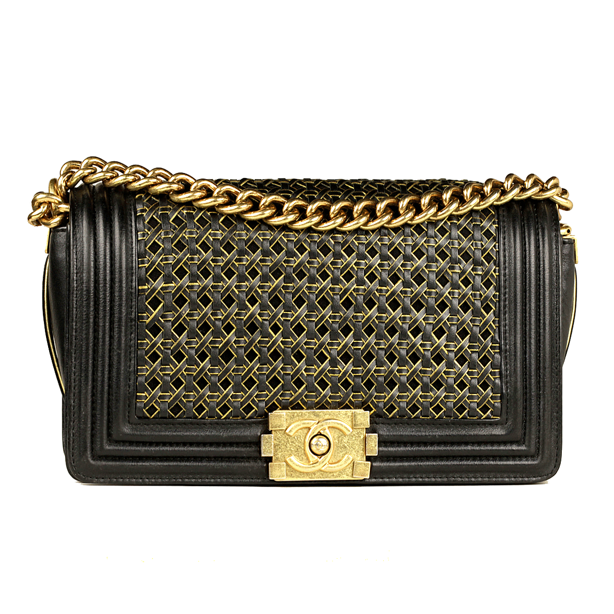 Sac Chanel Boy Medium en peau de mouton tressée noire Quincaillerie dorée
